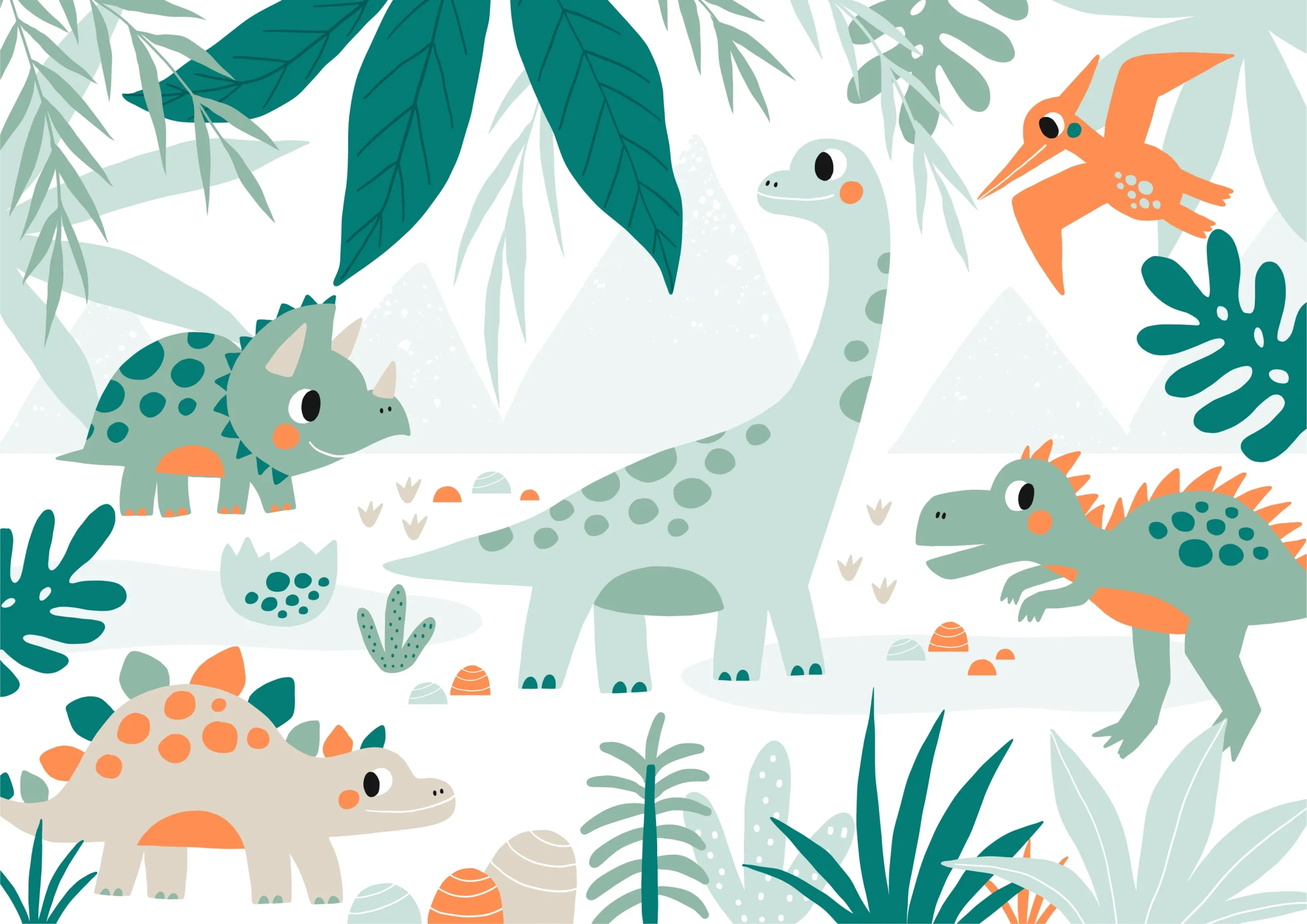 Dinos in Forest Wallpaper features playful dinosaur illustrations set within a lush forest scene, creating a fun and adventurous atmosphere. Perfect for kids’ rooms, nurseries, playrooms, and feature walls, it inspires imagination and creativity. Available in Dubai, UAE with premium-quality wallpaper and professional installation by Mwalls.