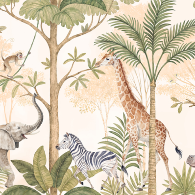 Jungle Adventure Playland Wall Mural features a vibrant jungle scene with playful wildlife and lush greenery that sparks imagination and excitement. Perfect for kids’ rooms, playrooms, bedrooms, and feature walls, it creates a fun and adventurous atmosphere. Available in Dubai, UAE with premium-quality mural wallpaper and professional installation by Mwalls.