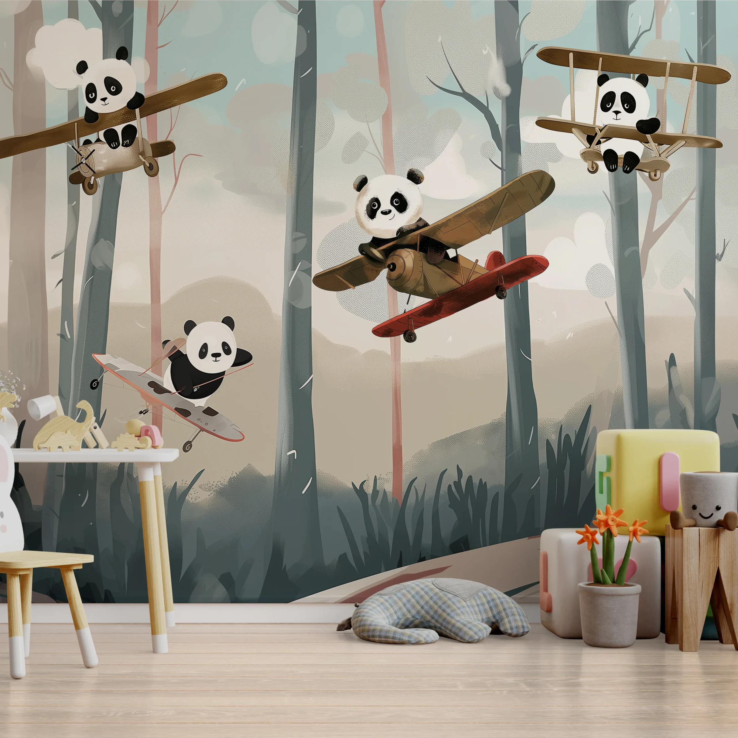 Pandas Playtime – Blue & Gold Wallpaper features adorable panda illustrations accented with calming blue shades and elegant golden highlights. Perfect for kids’ rooms, nurseries, playrooms, and feature walls, it creates a cheerful yet premium look. Available in Dubai, UAE with premium-quality wallpaper and professional installation by Mwalls.